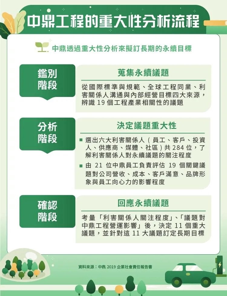 以 中鼎 9933-TW 0.14 % 工程的重大性分析為例,從下圖可以發現,中鼎首先從各種資料來源廣泛蒐集與工程業相關的永續議題,接著以下列兩個條件篩選對中鼎來說最具重大性的永續關鍵議題:( 1 ) 與中鼎的利害關係人是否迫切相關 ( 2 ) 對中鼎的本業經營有重大影響,最後依照評估結果訂定企業長期發展目標,確立營運方向。