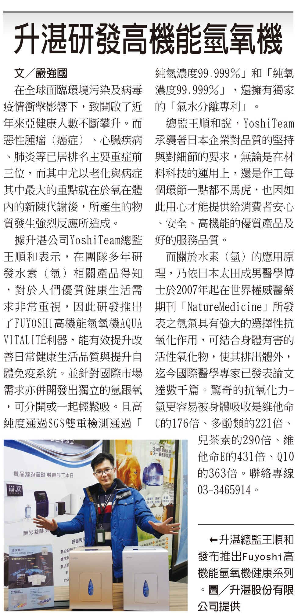 據升湛公司YoshiTeam總監王順和表示,在團隊多年研發水素(氫)相關產品得知,對於人們優質健康生活需求非常重視,因此研發推出了FUYOSHI高機能氫氧機AQUA VITALIT利器,能有效提升改善日常健康生活品質與提升自體免疫系統。並針對國際市場需求亦併開發出獨立的氫跟氧,可分開或一起輕鬆吸。且高純度通過SGS雙重檢測通過「純氫濃度99.999%」和「純氧濃度99.999%」,還擁有獨家的「氣水分離專利」。