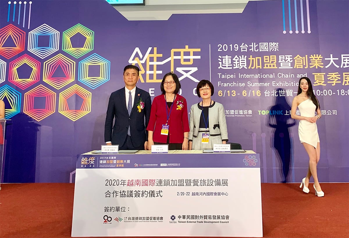 首屆「越南國際連鎖加盟暨餐旅設備展(Franchise, Retail & Hospitality Vietnam 2020)」將於明(109)年2月20日至22日於河內國際會展中心I.C.E盛大展出,該展由外貿協會及台灣連鎖加盟促進協會聯合主辦,展覽鎖定連鎖加盟、開店零售、餐旅設備及電子商務等四大主題,共同打造一條龍式的展覽,匯聚台灣連鎖加盟及餐旅設備廠商插旗越南。