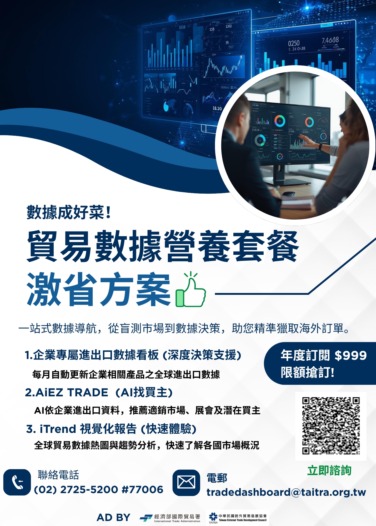 在全球經貿環境瞬息萬變的今天,資訊落後可能導致與海外的千萬訂單擦身而過 。iTrend 與 AiEZ TRADE提供的免費數據洞察是企業的基本功,而「企業專屬進出口數據看板」則是決定勝負的關鍵武器。當競爭對手還在依靠直覺猜測市場時,獲取數位時代最稀缺的「預見力」將是勝出關鍵。感興趣的企業請即刻前往官方報名連結,或電洽外貿協會諮詢熱線,搶占您的數據主位。