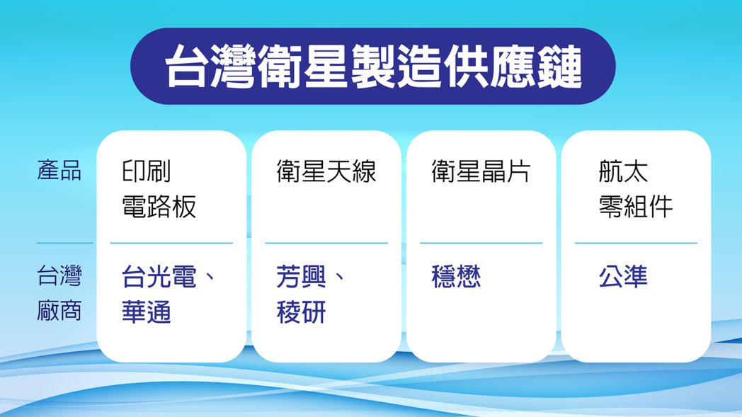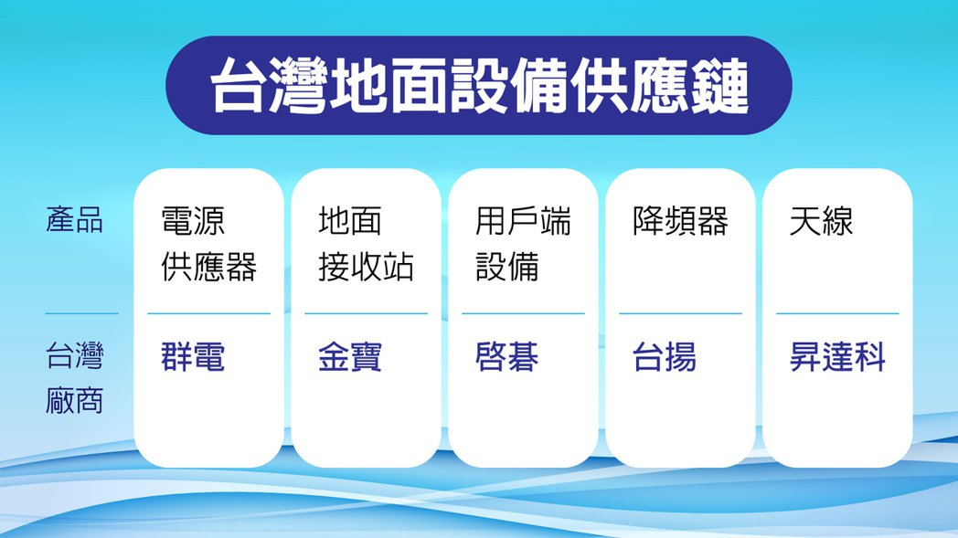 低軌衛星供應鏈大致分為兩個部分,包括衛星製造與地面設備。衛星製造部分包含印刷電路板、衛星天線、衛星晶片以及相關的航太零組件。地面設備則包括電源供應器、地面接收站、用戶端設備、降頻器以及天線等。其中地面設備是台灣廠商布局較成熟的產業。