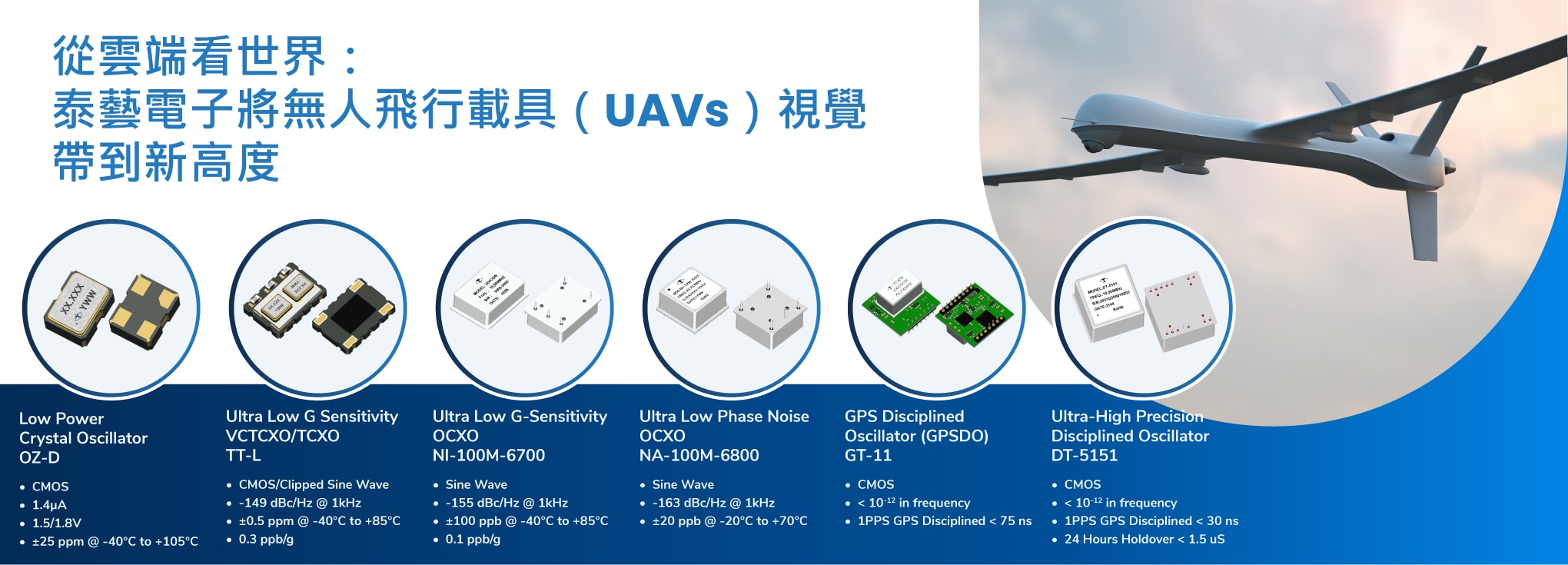 近年來,無人飛行載具(UAVs)市場經歷了驚人的發展,從消費者娛樂到商業和科研領域,對影像品質和飛行穩定性的要求也日益提高。泰藝電子的先進抗抖動晶體振盪器(Crystal Oscillator)為無人機的各種功能如無線通訊、微處理、藍牙/Wi-Fi、時間捕捉、相機、感測器以及導航提供了精確的時間解決方案。