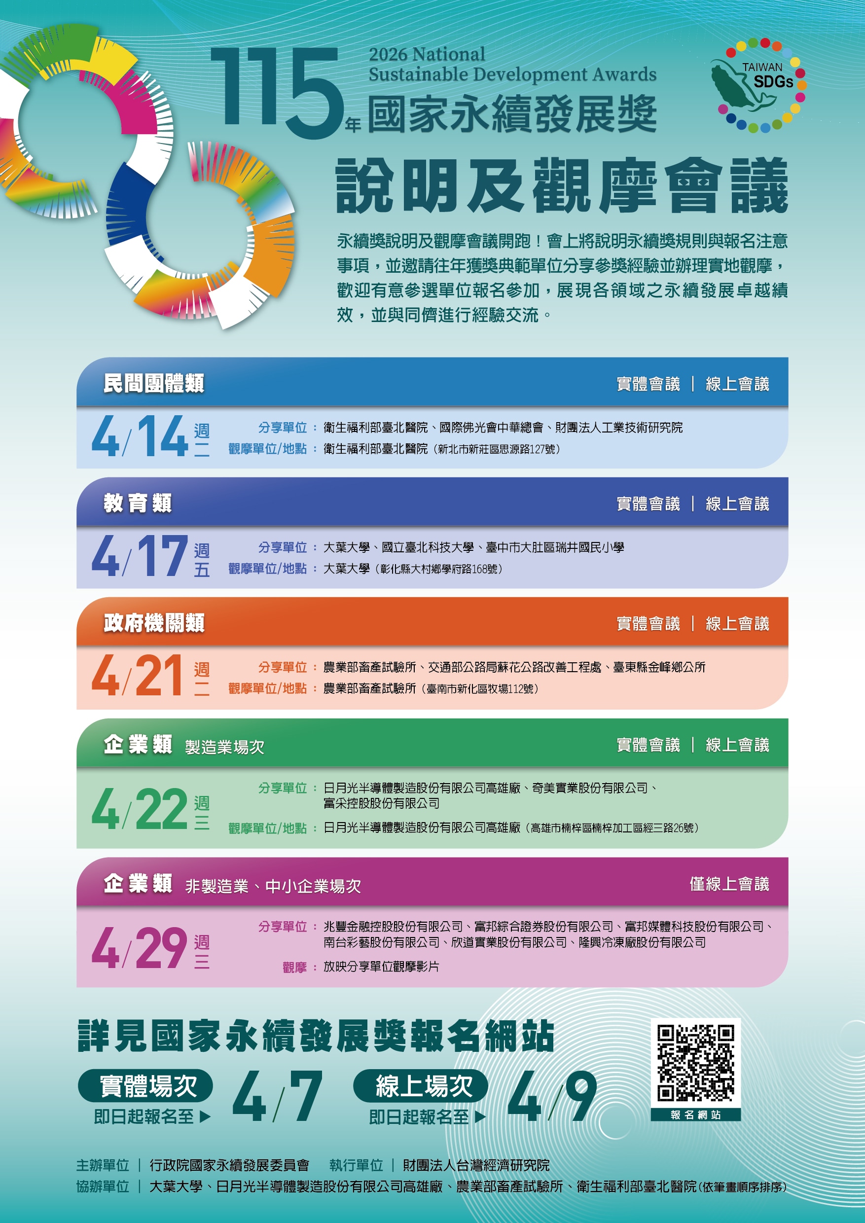 三、為增進各界對於國家永續發展獎之瞭解,並促進永續發展相關經驗互相交流與分享,本會另舉辦「115年國家永續發展獎說明及觀摩會議」共計5場次,均可免費線上報名,歡迎有意參加本年度國家永續發展獎選拔者踴躍參加,活動資訊請參考附件,活動資訊網址:https://gov.tw/XST)。