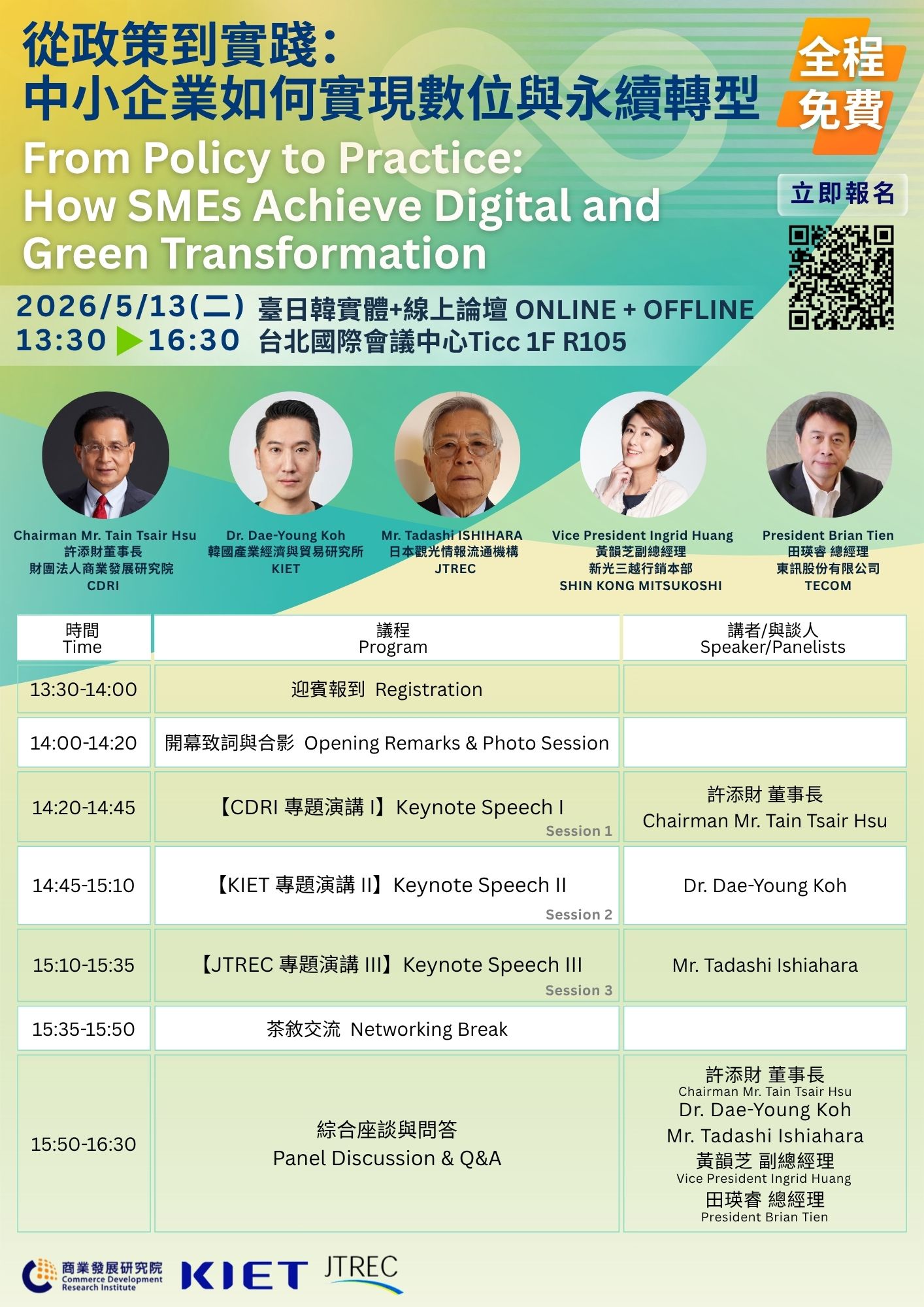 一、隨著全球產業環境劇變,數位化與永續經營已成為企業競爭力之關鍵。本院為協助國內法人與企業掌握國際發展趨勢,特舉辦本次國際研討會,邀請臺日韓專家學者針對數位與永續轉型之策略及實務應用進行深度探討。