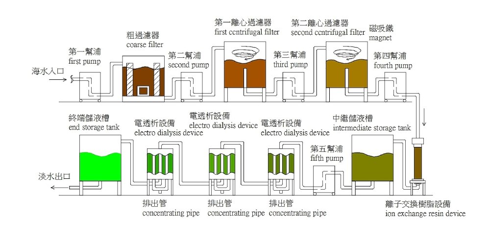 主典超導系統專門為有效運用水資源產能而生,是一套環保綠能系統。發明人介紹,運作原理與特色很簡單:一,當海水流進本設備的第一與第二段水道及儲水槽,水將會透過虹吸水力發電機自動發電,以虹吸原理帶動水輪機運轉,發電機、馬達運轉時產生的電力,就儲存至電控箱或供給超導體海水淡化處理系統使用。二,系統為往復式,不同顏色的桶子分別進行補水與電容脫鹽,待脫鹽完畢,氯離子及鈉離子會各別收集到氫與鈉的儲存桶,再用於其他工業用途, 同時將桶中已淡化過的海水排出;負責補水、電容脫鹽、排水的三道步驟就如此不斷循環、生生不息。