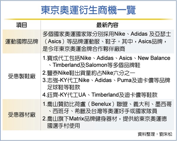 尤其擁有東奧主場優勢的日本品牌Asics,不僅被日本及澳洲國家隊的運動服採用,且是今年東奧金牌合作夥伴廠商,一旦銷售市況轉強,包括代工Asics鞋的寶成越南廠、印尼廠,業績都可直接受惠。