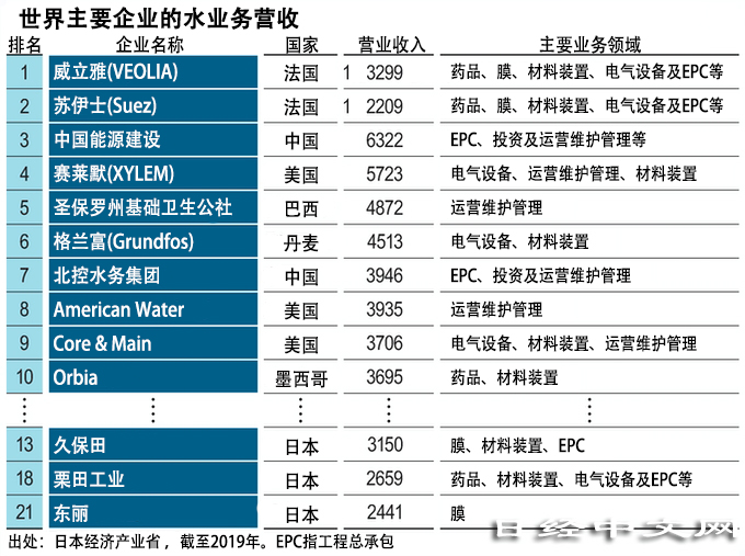 日本企業水務相關銷售額規模與被稱作「水務巨頭」的法國威立雅(Veolia)等全球大型水務企業相比,要小得多。雖然供應的部件和材料都是一級品,但從水設施的設計採購施工(EPC)到運營維護的整套系統卻沒有承接海外訂單的能力。水環保問題專家、Global Water Japan的代表吉村和就指出「日本企業需要具有綜合的製造能力」。