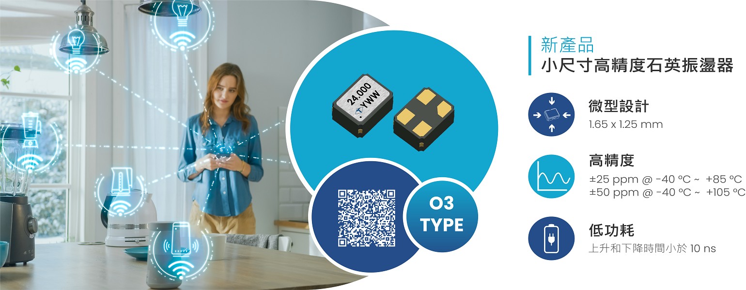 泰藝電子推出 O3 TYPE 微型高精度石英振盪器,以滿足行動應用產品對於高精度、小型化、低功耗的需求。O3 TYPE 石英振盪器採用 1.65 x 1.25mm 小尺寸設計,比 2.50 x 2.00mm 封裝尺寸小60%,可以輕鬆適應各種小型化設計應用。O3 TYPE 石英振盪器在 -40°C 到 +85°C 的工作溫度範圍內,具有 ±25ppm 的優秀頻率穩定性,同時在 -40°C 到 +105°C 範圍內也有 ±50ppm 的穩定表現,可滿足高精度時序要求。此外,O3 TYPE 石英振盪器具備 tri-state 快速 enable/disable 功能,上升和下降時間小於 10ns,可以有效降低功耗。O3 TYPE 石英振盪器的獨特功能對於小型移動應用非常有幫助,如 5G 手機、智慧手錶、智慧家居、智慧眼鏡、物聯網、虛擬實境/擴增實境裝置、藍芽、無線充電等產品。歡迎有需求的客戶聯繫泰藝電子的銷售團隊獲取更多產品資訊和樣品試用。