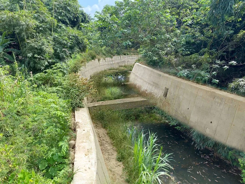 高雄市辦理「燕巢區金山二號橋上游野溪整治工程」,整治前引水路因長期缺乏整治,導致邊坡土砂常受洪水沖刷流入阿公店水庫內。圖/高雄市水利局提供