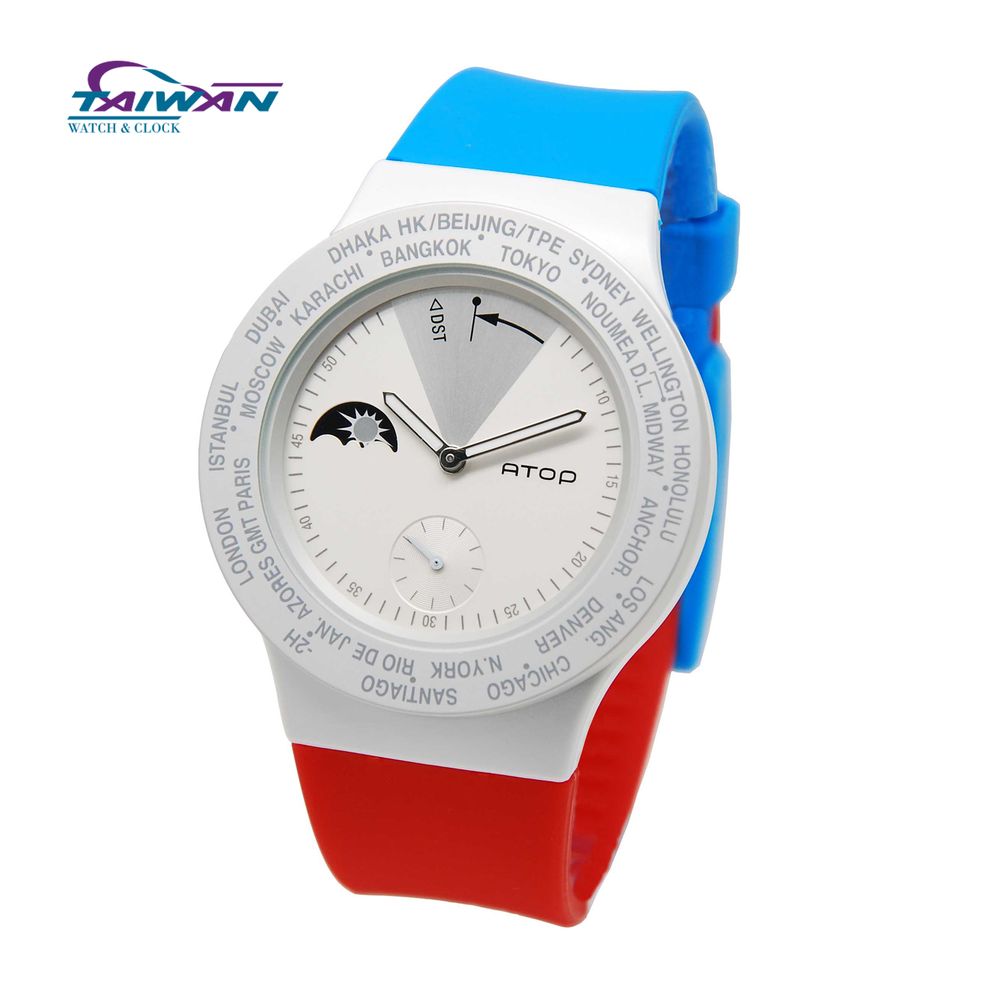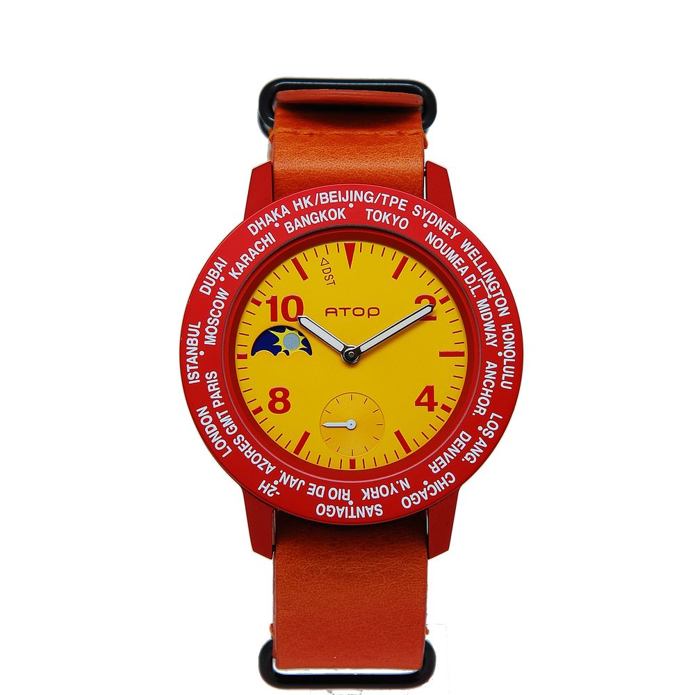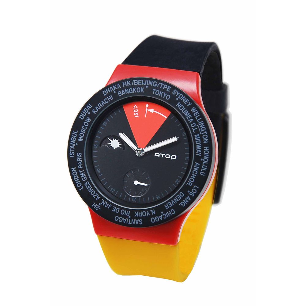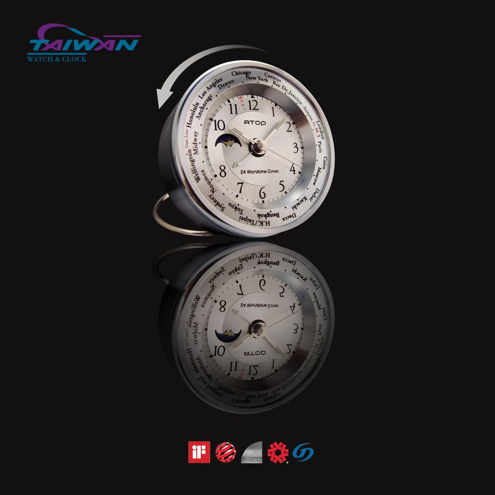 「世界時區手錶/時鐘」以獨特結構記憶世界24時區的轉換規則,只要逆時針轉動城市時區轉盤對準12點處,時針就會自動前往當地時間,若對準錶面DST標記處則是夏令日光節約時間,介面直覺、操作簡單,並以太陽與月亮代表白天與夜晚,在轉動中融入有如環繞地球的趣味。