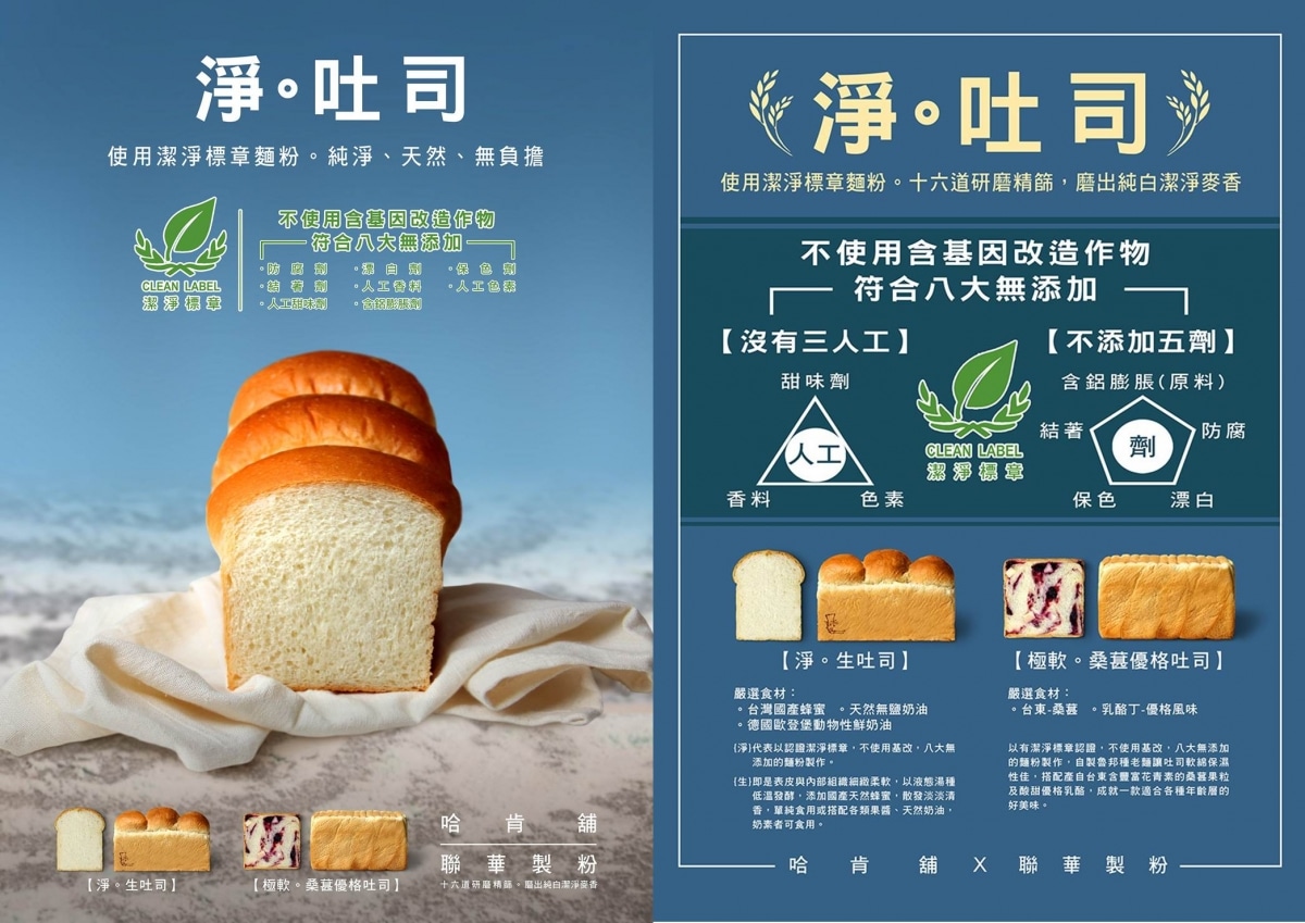 此次新推出使用潔淨標章認證麵粉的「淨.生吐司」與「極軟.桑葚優格吐司」兩款麵包,同樣也看到哈肯舖的用心,聯華製粉所生產的潔淨標章認證麵粉,是經過16次反覆的研磨與過篩,磨出潔白又細緻的麵粉,出廠前都需經過實驗室確認品質以達到完美,而且通過Clean Label認證,嚴謹守護、多重把關小麥原料及麵粉成品。