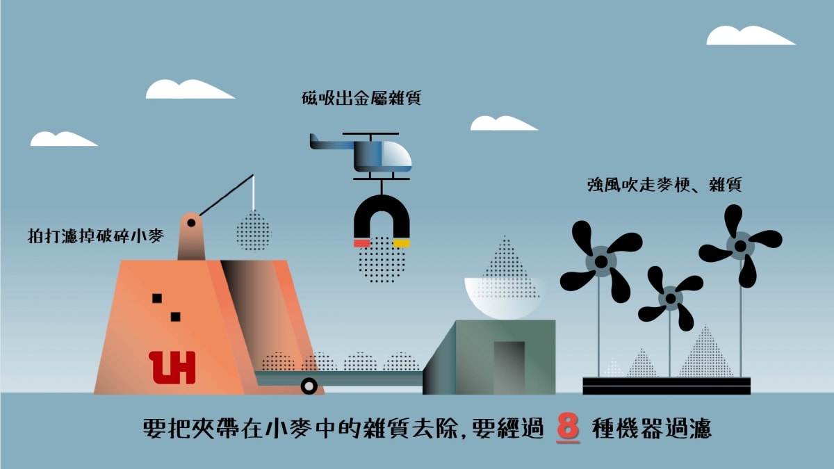 風塵僕僕的小麥,會夾帶灰塵、土石、麥梗、金屬塊甚至有破碎的小麥以及偽裝成小麥的雜糧,例如大麥或是黃豆,雖然量不多但卻會影響麵粉製成的品質。