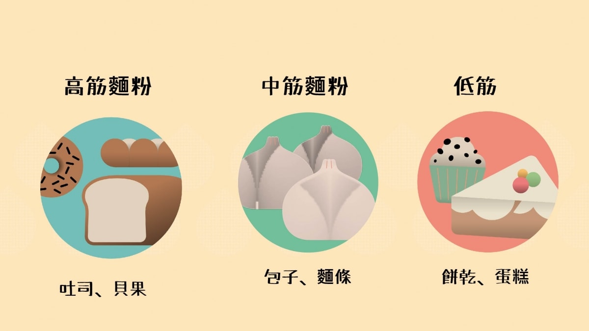 麵粉的筋性來自不同種小麥的蛋白質含量,蛋白質越多麵團的筋性就越強,根據筋性加工的適用產品,高筋麵粉可以製作成吐司、貝果等麵包製品,中筋麵粉適合製作成中式如包子、饅頭以及麵條,低筋麵粉則適合製作成餅乾、鬆餅與蛋糕等點心。