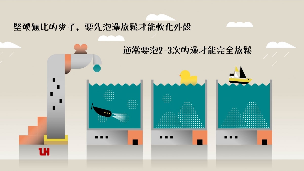小麥外殼的含水量非常低因此堅強無比,經過精篩後的小麥需要浸泡在水中長達36-48小時,目的是將小麥的外殼完全浸潤軟化,徹底浸潤小麥外殼才能被一層層剝開,下個階段才是真正磨麥的開始。
