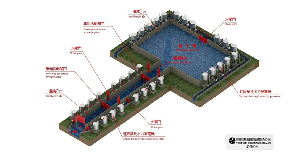 潮汐虹吸發電系統暨超導體淡化系統架構圖。圖/主典提供