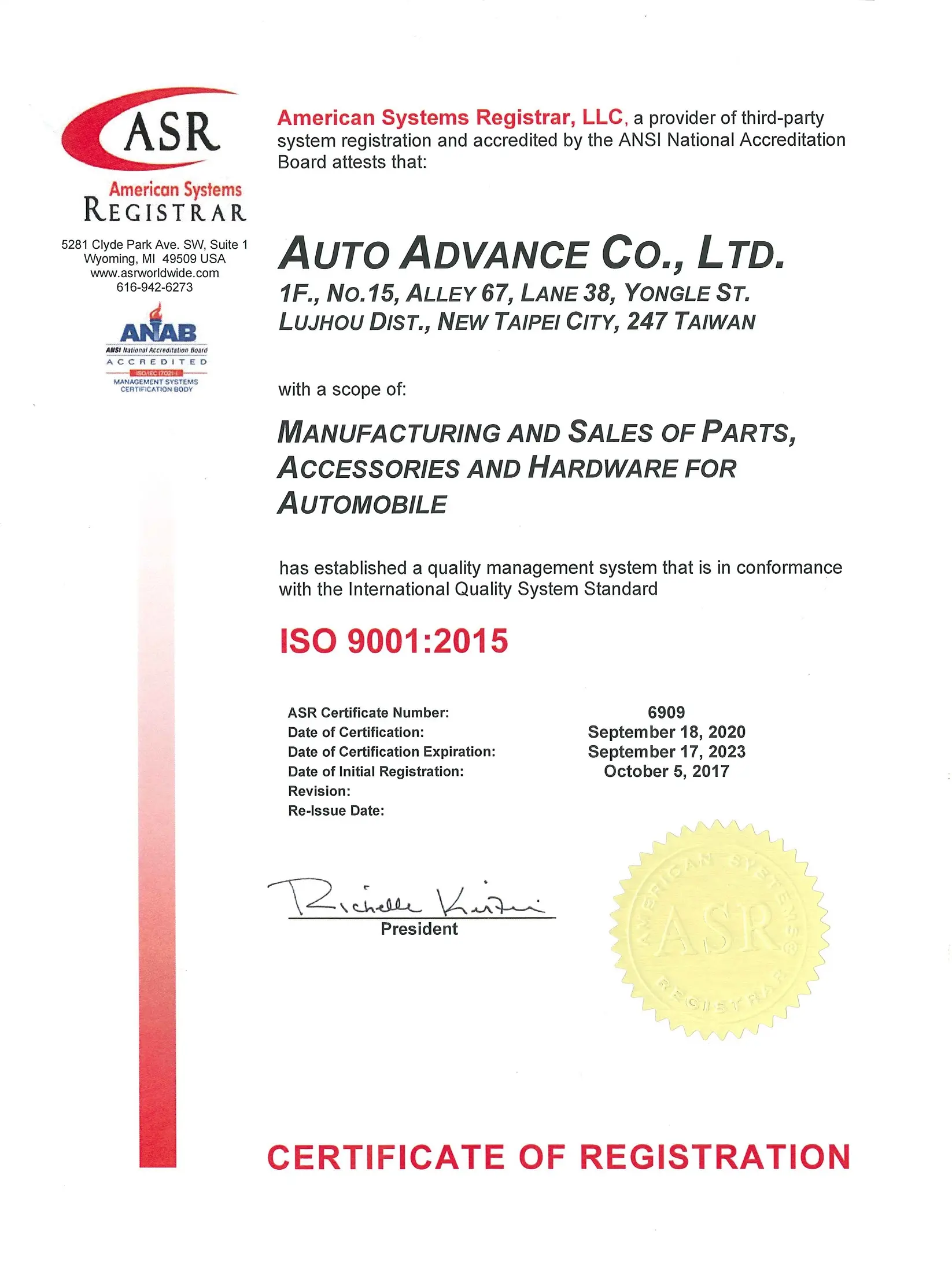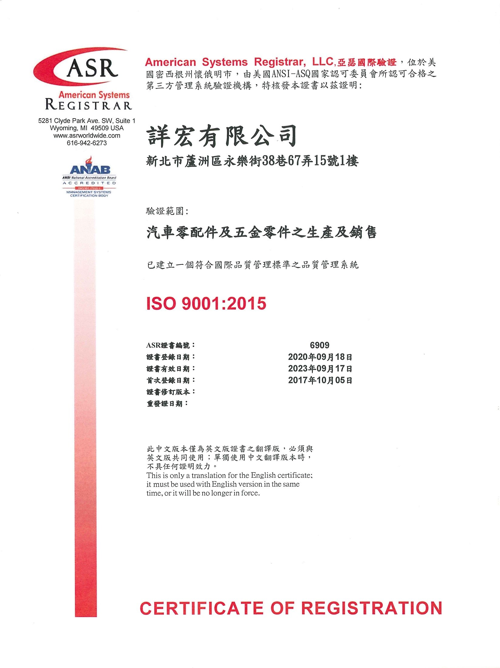詳宏有限公司 通過 ISO 9001:2015 品質管理系統 並取得證書