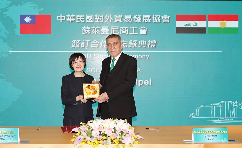 外貿協會今(12)日由林芳苗副秘書長代表,與伊拉克庫德區蘇萊曼尼商工會(Sulaimany Chamber of Commerce and Industry, SCCI)主席Mr. Sirwan Mohammed Mahmood在臺北共同簽署合作備忘錄,期盼透過該會在伊拉克庫德區綿密的經貿網路,藉由企業交流、組團互訪、及市場資訊分享等方式,為雙邊企業尋求更多合作機會。