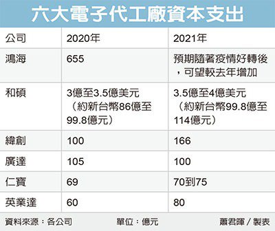 此外,鴻海積極發展電動車事業,今年6月底前將決定在北美設電動車廠,若規劃月產1萬輛的工廠,需投資10億美元,法人預估,鴻海2021年資本支出有機會較去年成長,亦即655億元起跳,金額居同業之冠。