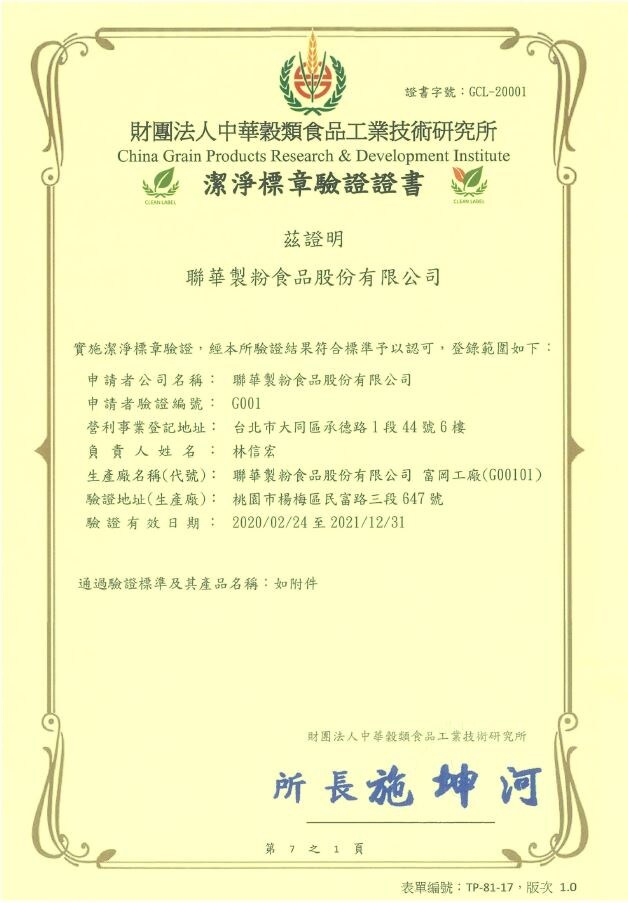 目前國內已有多家食品業者參與Clean Label潔淨標章認證,聯華製粉響應這股食安趨勢,由食安處於2019年底籌畫啟動Clean Label潔淨標章專案,協調跨部門、外部單位溝通整合後,透過中華穀類食品工業技術研究所進行驗證,進行各項書面審核、現場稽核、抽樣檢驗、包裝審查等程序,並於2020年3月通過Clean Label潔淨標章並取得證書。