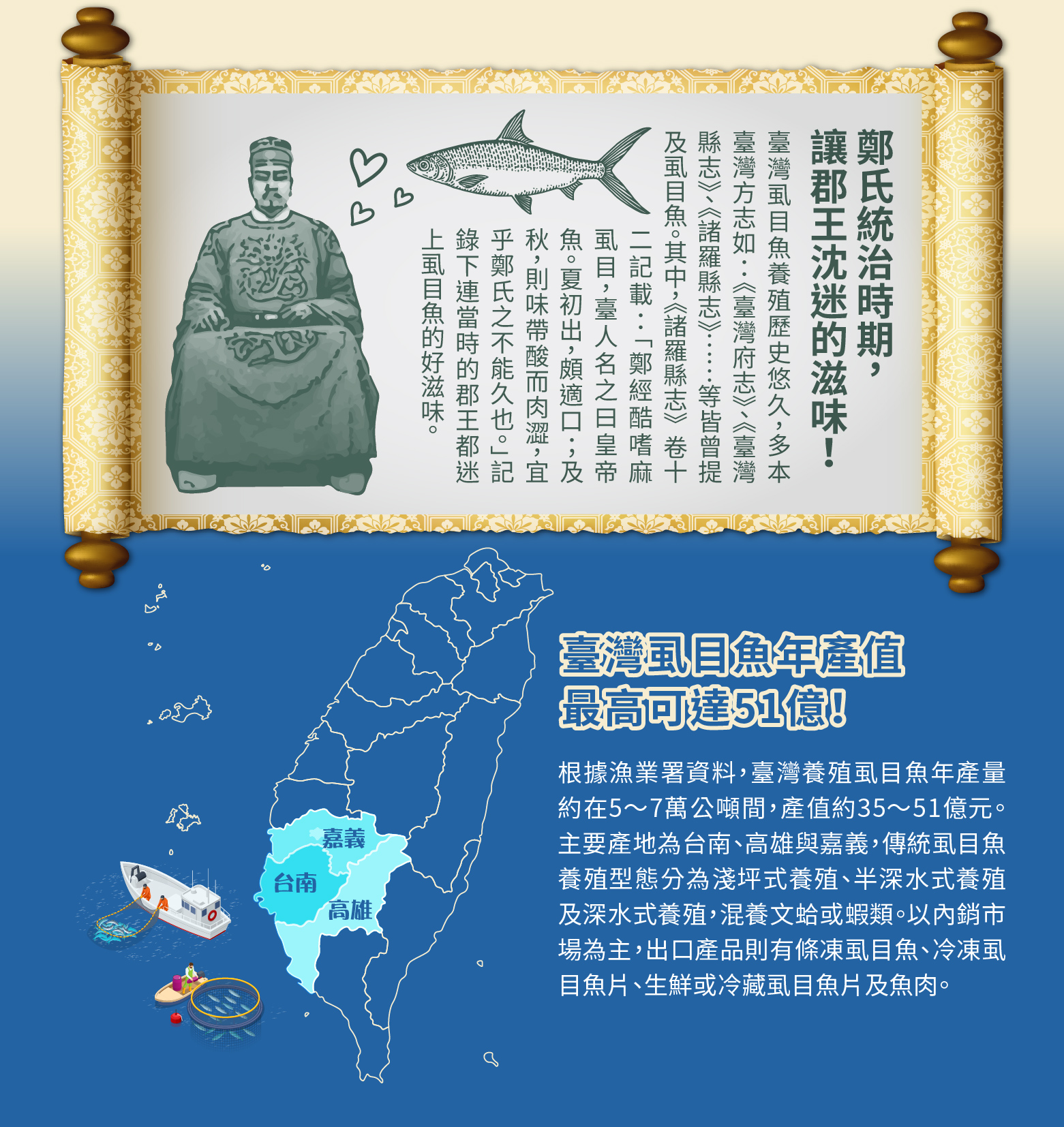 虱目魚在臺灣人工養殖的歷史已超過300年,也是規模最大的養殖漁業。漁業署表示,虱目魚年產量約6.5萬餘公噸,遠在明末清初鄭成功入臺前就有虱目魚的養殖。其肉質細緻、營養價值高,無論是大家常聽到的牛奶魚、狀元魚、思慕魚、國姓魚、皇帝魚⋯⋯等都是虱目魚的別稱,是民眾最熟悉也道地的家魚與古早味。