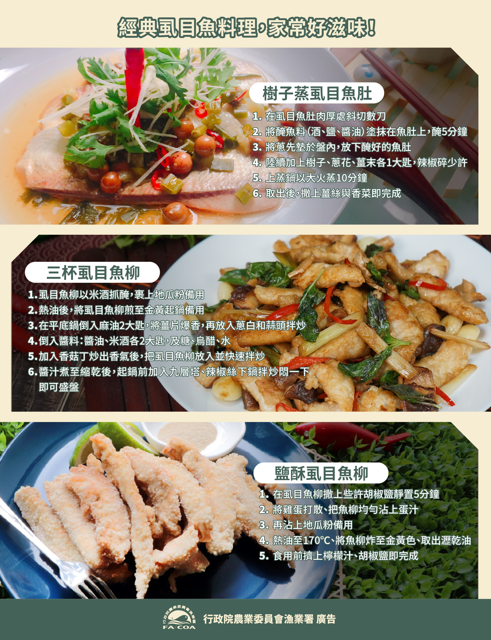 全身都能食用的虱目魚,適合多樣、多元的料理方式,不論乾煎虱目魚肚、魚頭燉湯或紅燒、魚骨熬湯增加湯頭鮮味或是虱目魚丸等,都是常見的家常料理。不僅美味,虱目魚更是中研院《臺灣海鮮選擇指南》出版物中,被推薦食用的魚類之一,臺灣的養殖虱目魚是符合生態保育與永續利用原則的海鮮,有助於臺灣海洋保育,不僅有利於環境,也符合食品安全、價格合理,你說,怎能不愛?