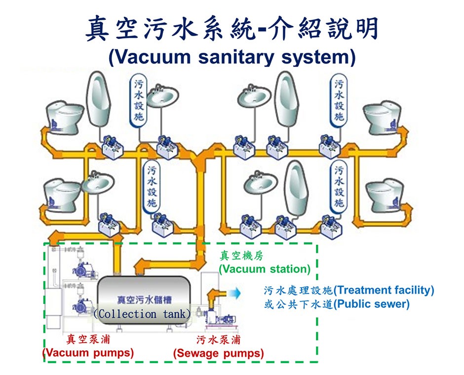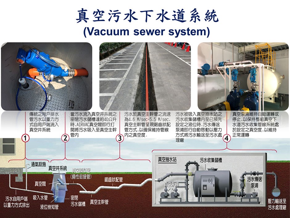 揚程管機業務經理李澤坤表示:「簡單來說,用戶污水會先被收集在真空井的污水槽中,到一定量後再藉由負壓及氣液混合方式,經真空管線快速輸送至真空站的儲槽內,待最後加壓輸送至污水處理廠或公共下水道系統。」