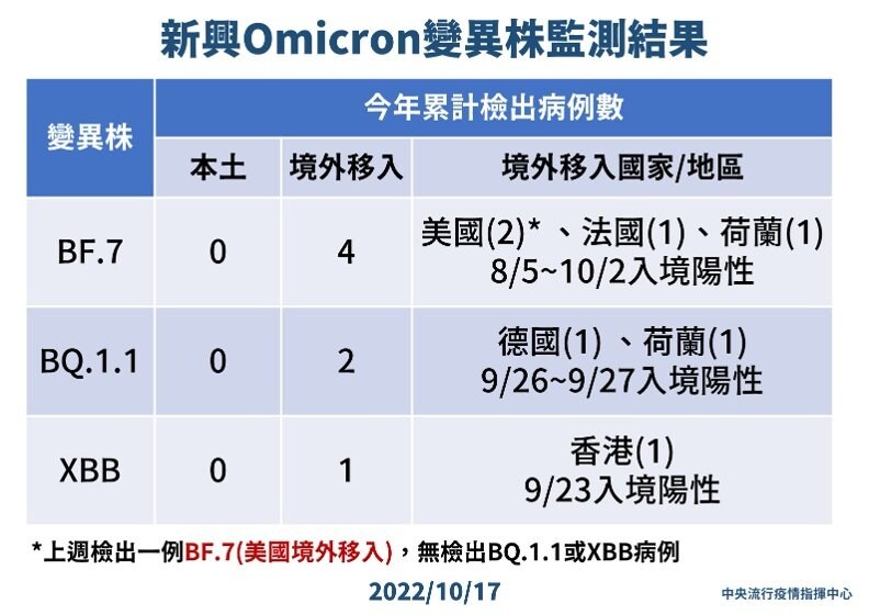 但值得注意的是,根據指揮中心每周一公布一周境外移入及本土Omicron變異株監測定序結果發現,截至2022年10月17日,國內已監測到4例BF.7、2例BQ.1.1和1例XBB境外移入個案,短短一週內就檢出共7例全球3大新興變異株,一再顯現新冠病毒的詭譎多變。