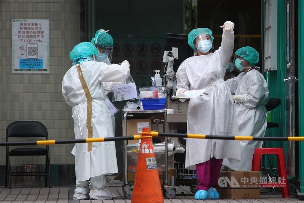 台灣新增333個本土確診病例,連3天破百。圖為新北市板橋區亞東醫院爆發院內傳染案件,醫院戶外篩檢區醫護人員忙著進行COVID-19篩檢作業。中央社記者王騰毅攝 110年5月17日