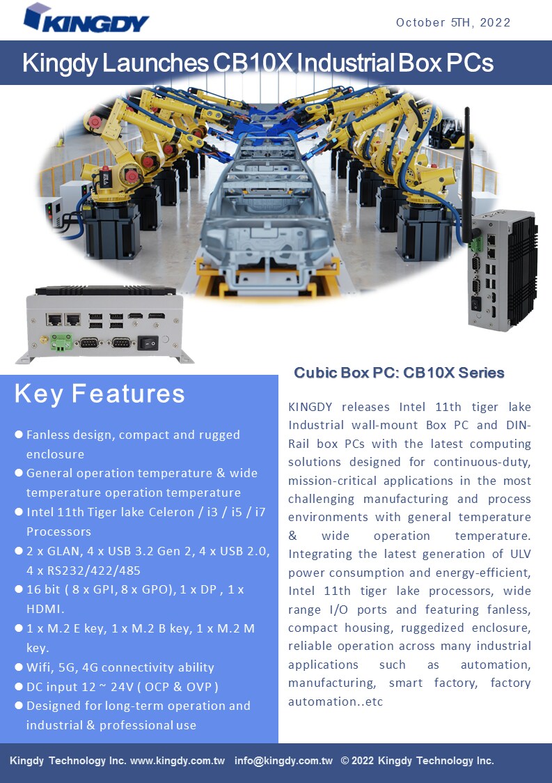 KINGDY發佈Intel第11代Tiger Lake工業壁掛式箱式PC和DIN Rail箱式PC,提供最新的解決方案,適用於一般溫度和寬工作溫度下最具挑戰性的製造和工藝環境中的連續工作、關鍵任務應用。 集成了最新一代ULV功耗和能效,Intel第11代Tiger Lake處理器,廣泛的I/O埠,具有無風扇、緊湊的外殼、堅固的外殼,可在自動化、製造、智慧工廠、工廠自動化等多種工業應用中可靠運行