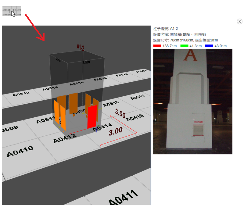 圖示,可放大、縮小攤位圖畫面。 - 點選柱子即可開啟「3D柱面資訊」視窗: