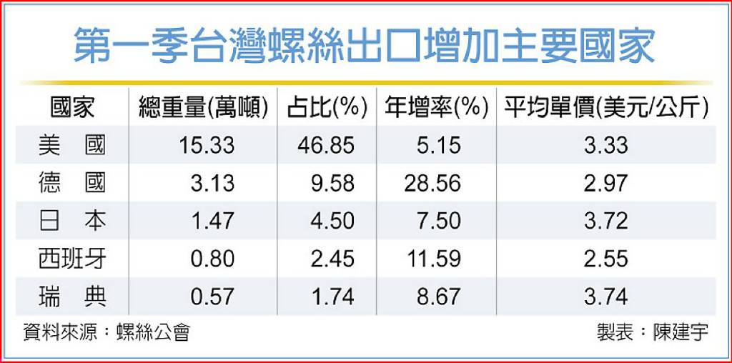 根據螺絲公會統計,國內螺絲第一季的出口量為32.71萬噸、年增3.37%,出口單價每公斤3.40元、年減2.82%。而出口國當中,墨西哥、大陸、澳洲及俄羅斯量減較明顯,不過銷往美國、日本、德國、西班牙、瑞典等國的數量則呈增加趨勢。