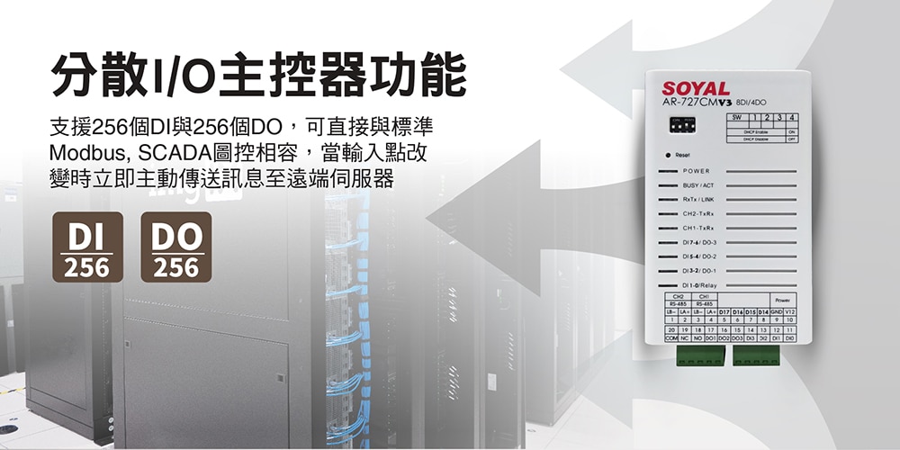 12.分散I/O主控器功能,支援256 DI與256 DO,可直接與標準Modbus, SCADA圖控相容,當輸入點改變時立即主動傳送訊息至遠端伺服器