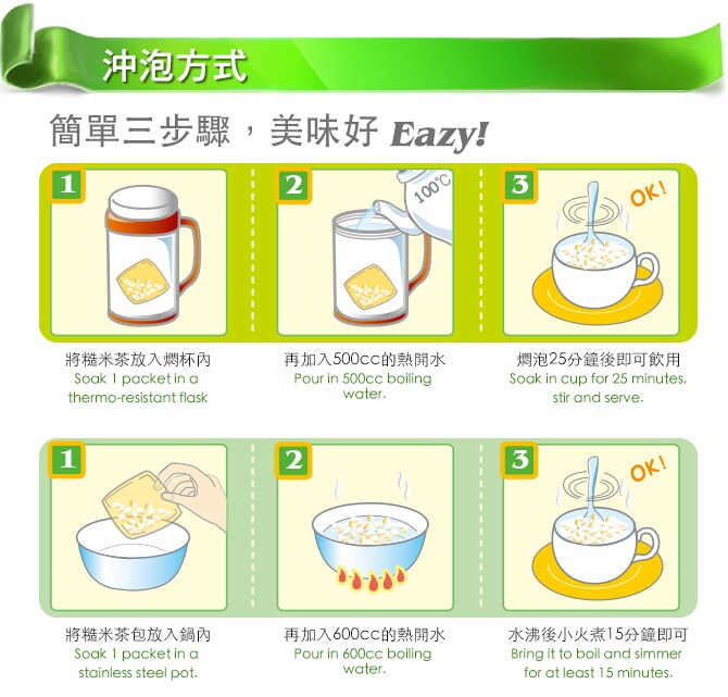 | 沖泡方式 | »沖泡法:將糙米茶包放入燜杯內,加入100°C熱開水約500cc水量,燜泡25分鐘即可飲用。 »水煮法:將糙米茶包放入鍋內,加入600cc水量,待水煮沸調至小火煮15分鐘即可飲用。 |