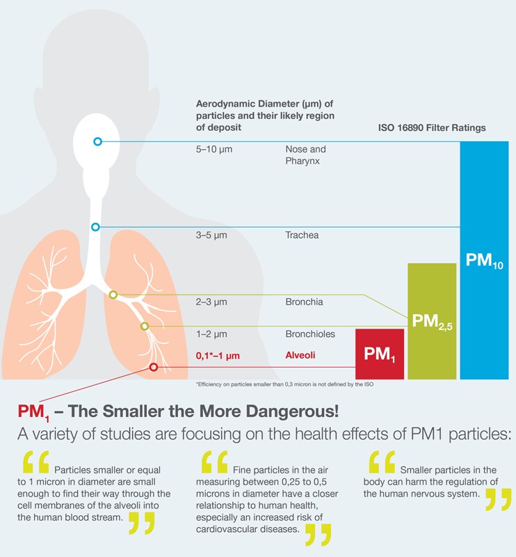 粒狀污染物(Particulate Matters)PM粉塵污染量測有PM2.5、PM10與PM1等指標。 由於空氣過濾行業ISO 16890新標準的通過,要求過濾器的效率由顆粒物的分級PM1、PM2.5、PM10來決定。基於顆粒沉積在人體肺部的位置,顆粒越輕越小,它在空氣中停留的時間就越長。現在大家已經在關注COVID-19新冠肺炎病毒經由空氣汙染氣溶膠傳播,超細懸浮微粒PM1粒徑比PM2.5更小,卻占了PM2.5細懸浮微粒大約7成的比率,對人體的危害更大,並影響大氣能見度。因此,現在不只PM2.5與PM10,空氣品質偵測器、空氣清淨機勢必需將PM1納入指標。