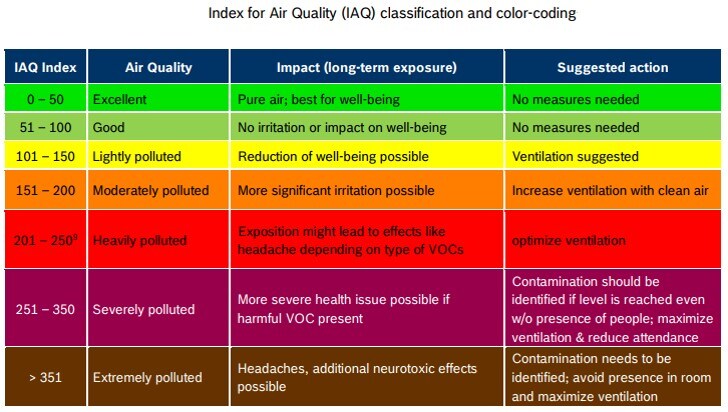 CurieJet® P760可偵測的氣體包括眾多來源的揮發性有機化合物 (VOC),如油漆 (如甲醛)、亮漆、脫漆劑、清潔劑、家具、辦公室設備、膠水、黏著劑和酒精。IAQ (Index for Air Quality)提供0~500的數值,可以視為VOC指數(VOC Index),以反映有害氣體污染程度(TVOC Level),並以color-coding提醒不同的VOC Index汙染風險。