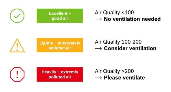 若有需求,也可提供eCO2 (CO2 equivalents) 的ppm數值。這是由人的呼出氣中VOCs和CO2之間的平均相關性得出,也可當作另一種通風指標。 請注意,eCO2 (CO2 equivalents) 並不是CO2值。
