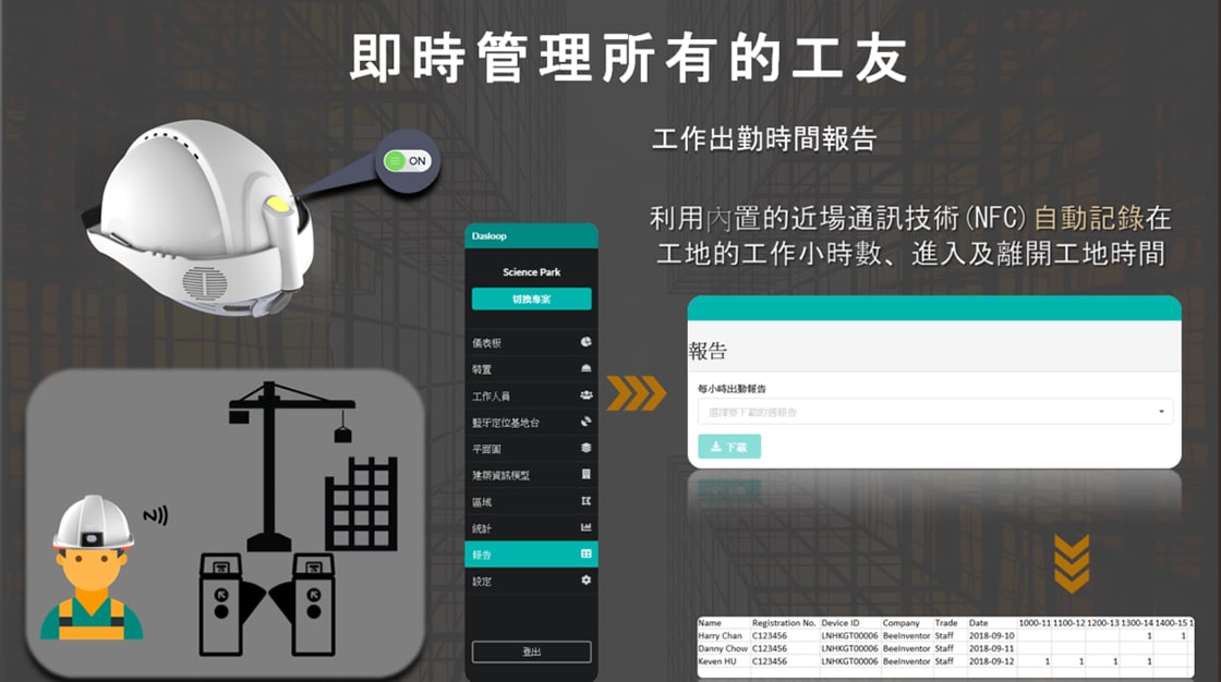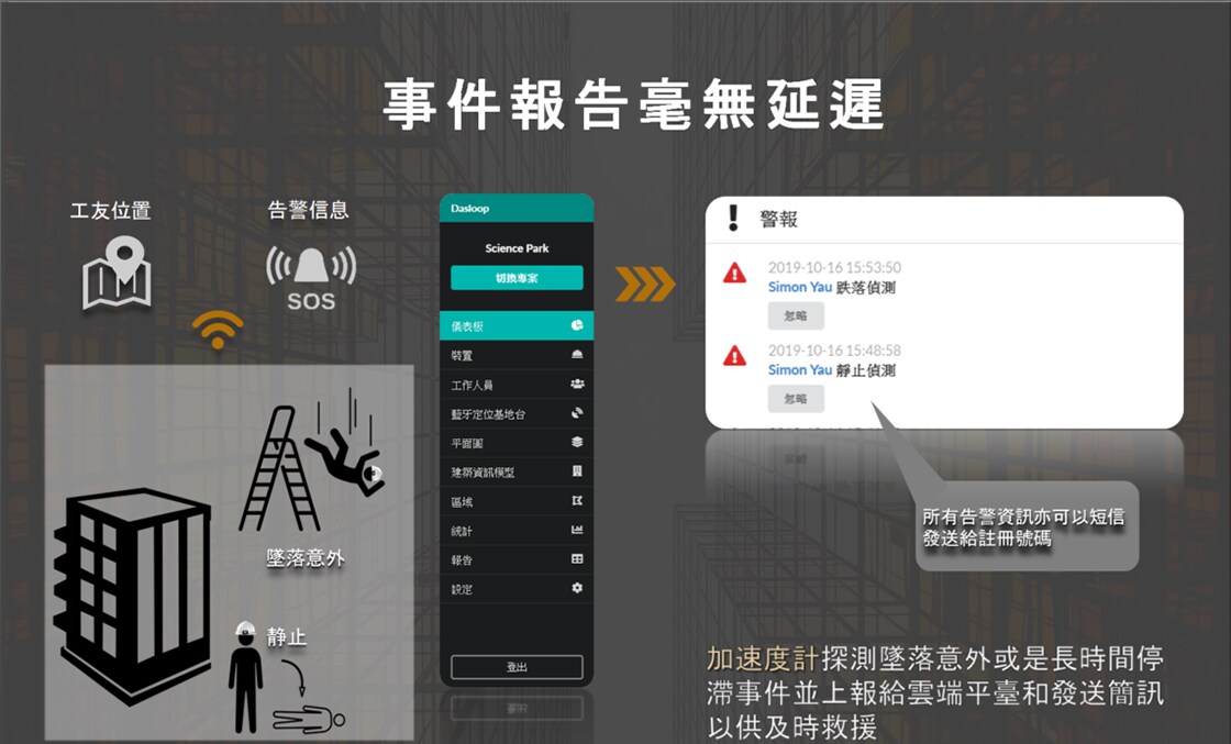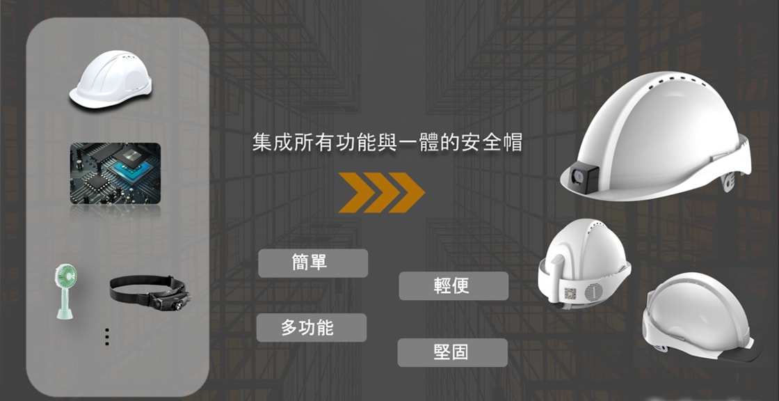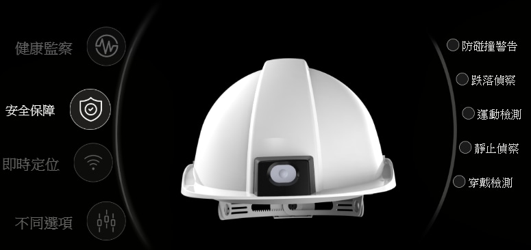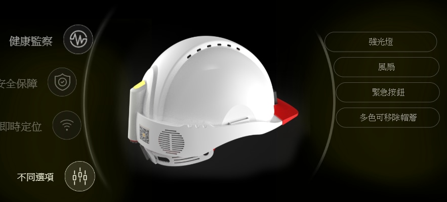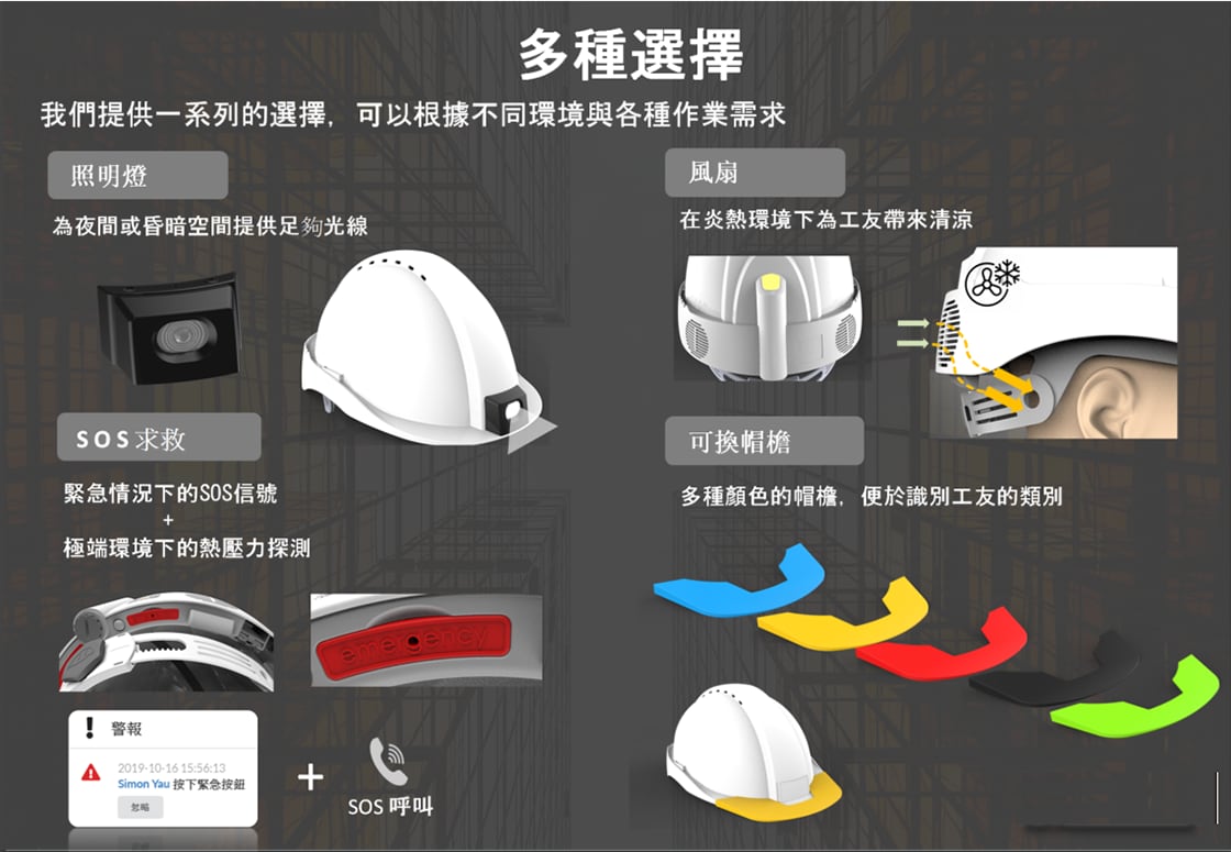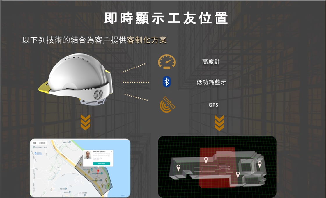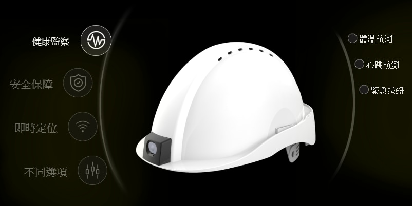 1)硬體:智慧安全帽(安全帽整合了生理訊號監測、動作監測、定位監測、求救按鈕)。