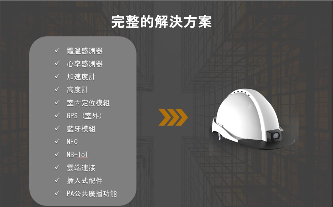 智慧安全帽定位系統整體解決方案,整合了各式感測器的應用來偵測人體的各項訊號並透過WiFi or NB-IoT 無線傳輸的方式來傳輸。