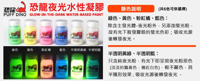 ● 有色系列 (綠色、黃色、粉紅橘、藍色):同時具有夜光及螢光效果;有光下呈現螢光色彩,吸光後置於黑暗處轉發夜光。半透明系列 (半透明黃綠、半透明藍):有光下呈現淡淡的鵝黃色(夜光粉原色),幾近白色,具有半隱形效果,吸光後置於黑暗處轉發夜光。