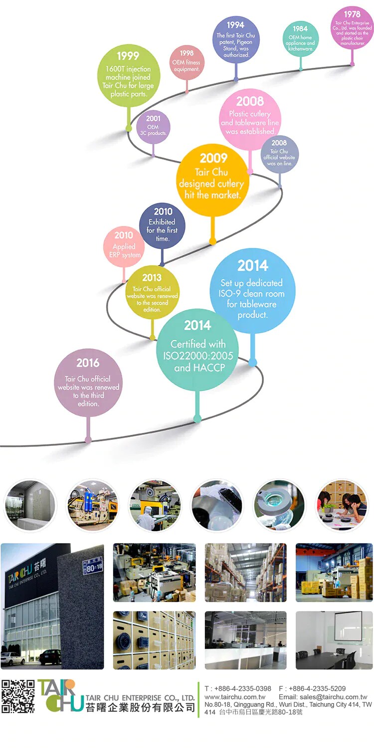 苔曙主要產品為環保塑膠餐具及精緻食品包裝容器,身為專業塑膠餐具製造工廠, 我們不斷地改善製程並更新技術,近年更投資大量生產設備並於2014年擴充廠房,以期所有射出的免洗餐具皆能符合國際食品衛生安全。 除了拋棄式餐具的開發之外,苔曙亦投入10條生產線, 為國內外知名品牌生產客製化塑膠射出產品(OEM),產品包括運動器材、3C產品、電器用品、汽車零配件等等。