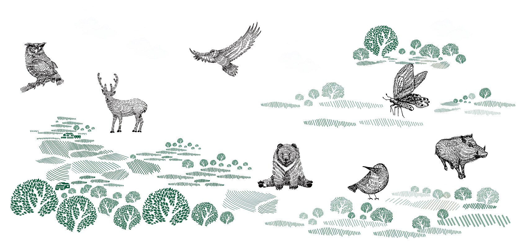 來自梨山黑森林的純淨甘露! 以"霽青色"做為禮盒的主色系,象徵雨過天晴的梨山黑森林天空,透過版畫的表現,勾勒出茶園景緻。貓頭鷹是原住民眼中的「報喜靈鳥」代表幸福、也守護著山林;另也手繪出黑森林原生物種,台灣黑熊、水鹿、山豬、紅頭山雀,意喻每一茶種的獨特口味,訴說古邁茶園與自然共生的永續堅持。
