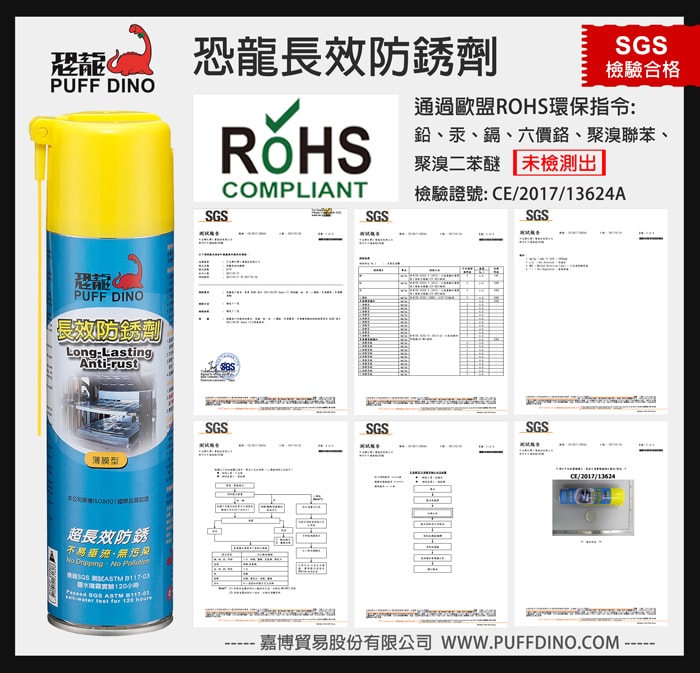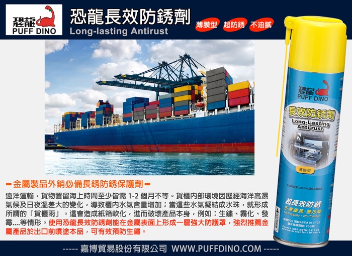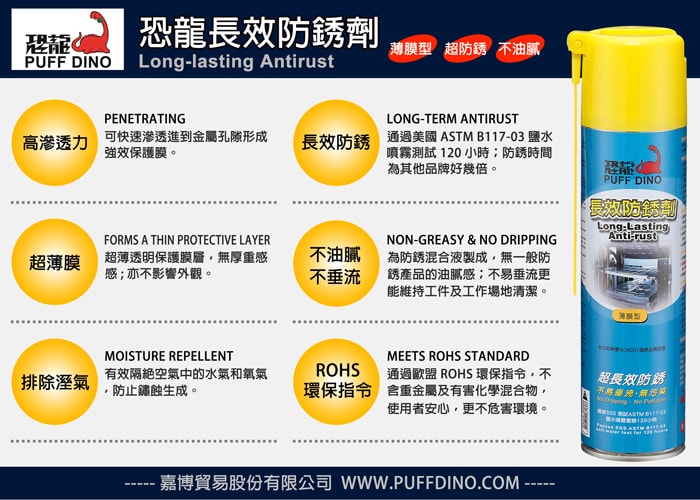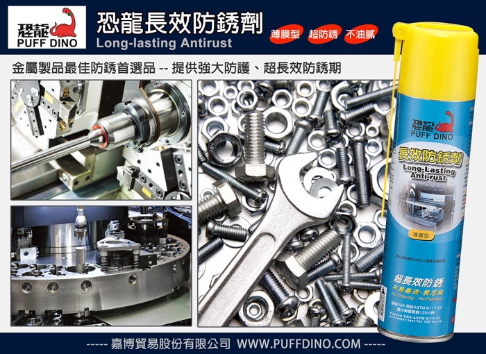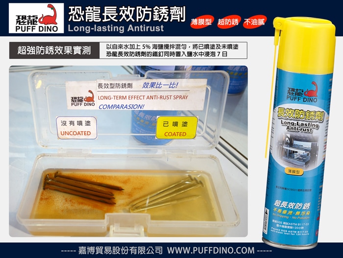 恐龍長效防銹劑專為長時間防銹而開發,比一般防銹產品的保護期限長好幾倍。油膜很薄,不會沾附大量灰塵,更不會造成環境髒污,是金屬長效防銹最好的產品。