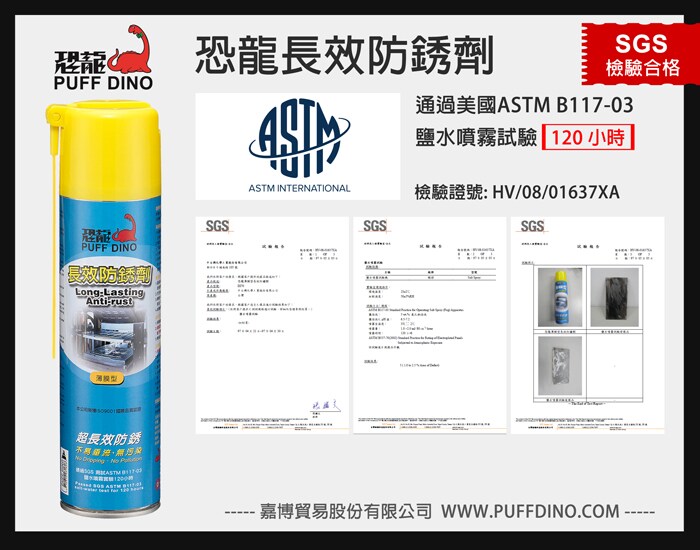 ● 長效防鏽:通過SGS測試 ASTM B117-03 鹽水噴霧實驗120小時,防銹時間長。⇒ 市面上一般防銹油只有48-72小時。
