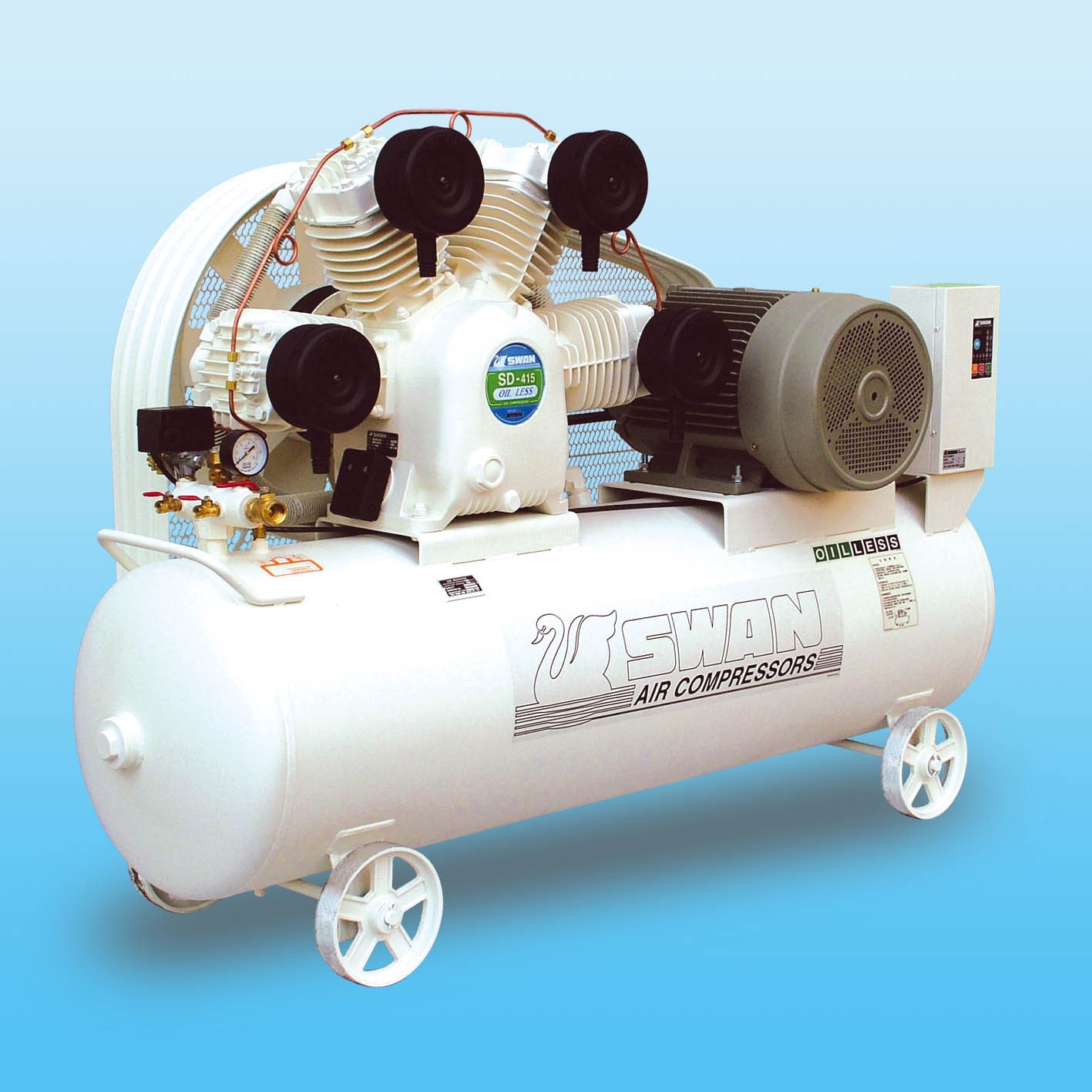 天鵝牌空壓機SD系列針對環境保護的世界潮流而開發設計的,不需添加潤滑油,免除油氣與油水混合物二次排放所造成的污染,實現了無油潔淨的壓縮空氣品質的理想。